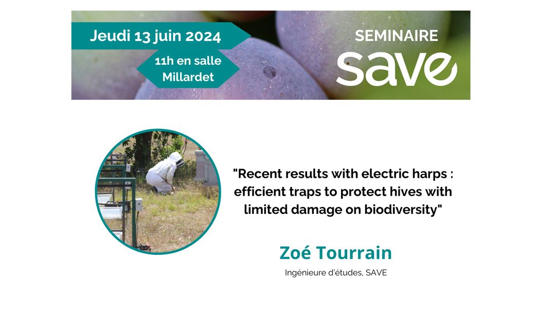 Le jeudi 13 juin 2024 à partir de 11h vous êtes tous conviés au séminaire de Zoé Tourrain, IE dans l’équipe Biodiversité de SAVE. Sa présentation aura lieu en salle Millardet.
